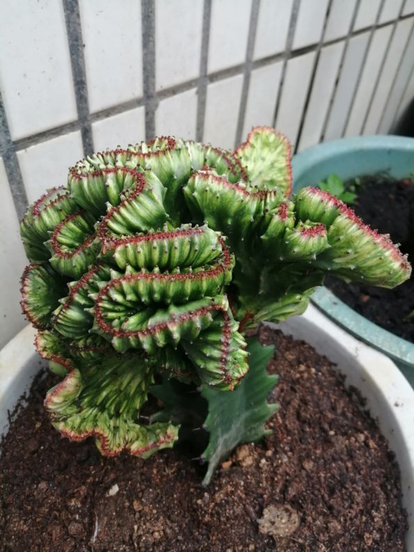 春峰的肉质茎是比较独特的,不同品种的颜色也是不同的,有的是乳白色、暗紫红色,也有的是有斑纹的、镶边的,很好看。从外形来看,肉质茎很像鸡冠状,也很像山峦、奇石,可放在室内供人欣赏。有时候会因养护的问题,它的茎会生长为柱状,这其实就是发生了返租的情况。