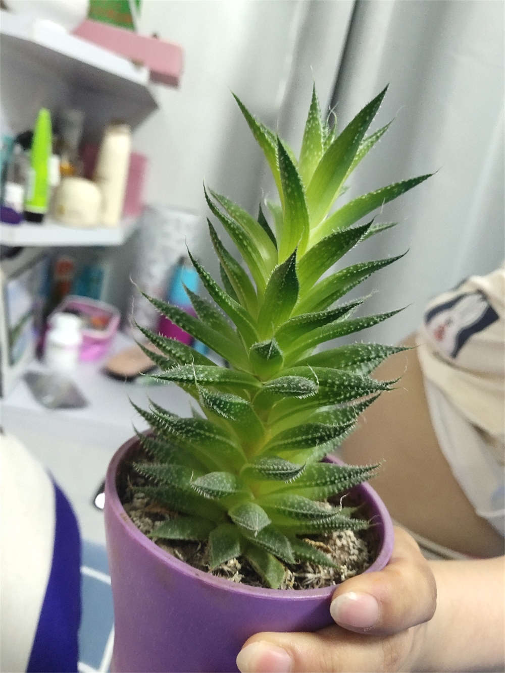 绫锦的叶盘呈莲座状,直径能达到20cm左右,叶子生长的十分紧凑,一棵植株有大概40~50片叶子。它的叶子为深绿色,顶部十分的尖锐,叶长大概有7~8cm,上面有白色的斑点,边缘有着较密的锯齿。绫锦也是会开花的,花期是在秋季,花朵为橙红色,观赏价值可以说是很高的。