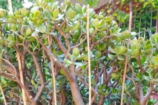 20年的玉树,为防止长疯,盆里插了一圈竹棍!