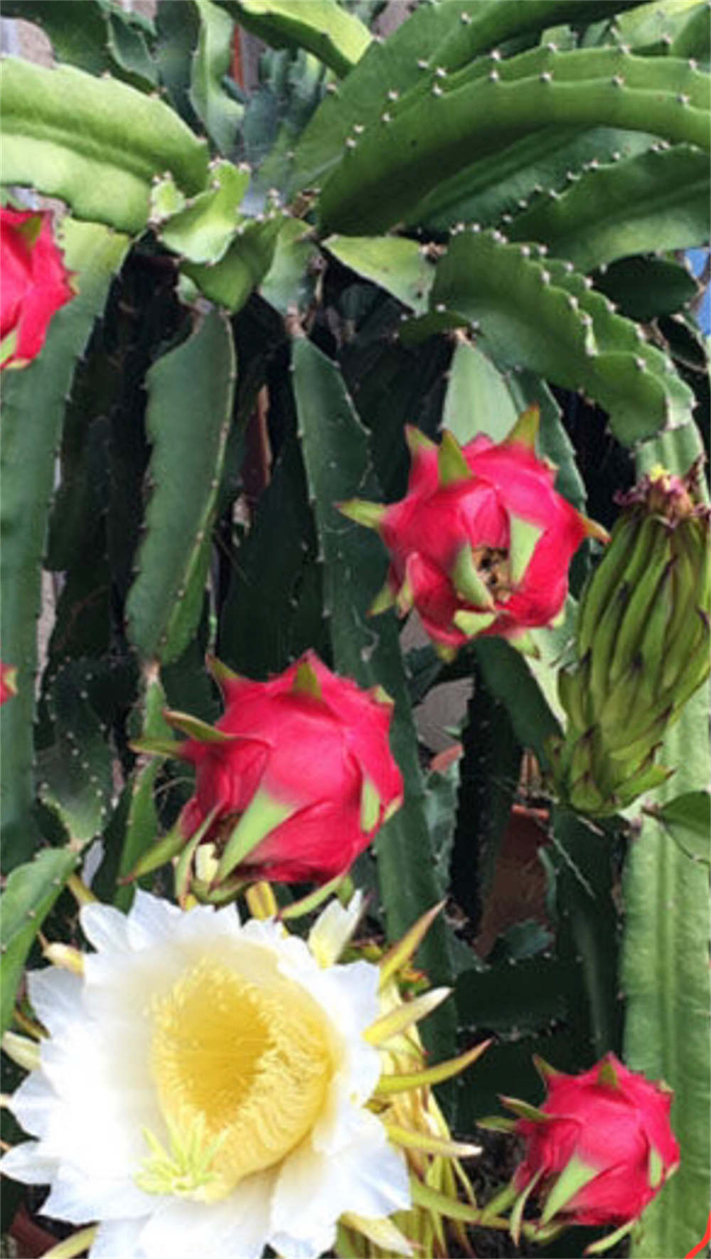 火龙果树和令箭荷花都是仙人掌科的植物,但二者的差别还是不小的。火龙果树也叫量天尺,茎为三棱状,花是漏斗形,颜色为黄白色,果实为球形浆果,也就是火龙果。令箭荷花的茎比较扁,而且有很多分枝,花为喇叭状,颜色为紫红、大红、粉红和洋红等。