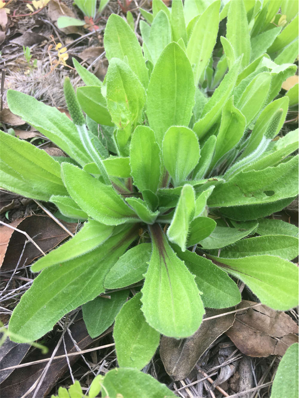 车前草为一年生或二年生草本植物,它的叶片为纸质,呈椭圆形、卵状披针形、椭圆状披针形,叶片上有5-7条叶脉,在叶片正面凹陷,背面明显隆起,穗状花序,为细圆柱状,苞片为三角状卵形,花冠白色。