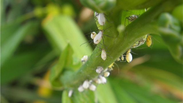 人工防治:把蚜虫用毛笔或毛刷给刷掉。植物驱虫:可以利用韭菜的特殊气味驱除蚜虫。风油精防治:将风油精加入600到800倍的水稀释后倒入喷雾器,喷洒在害虫上。烟叶驱虫法:取干烟叶加水,比例1:20,24小时后进行过滤,喷洒。
