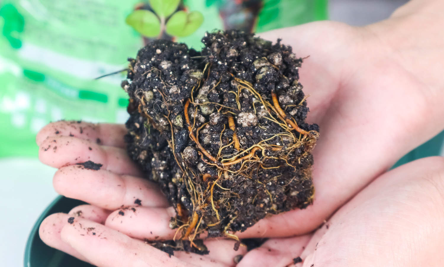 将扦插苗从基质中取出,去掉根部的泥土。去土时要小心,避免伤到它的根系。然后将它直立放入花盆中,用土将其填满,之后浇透水。